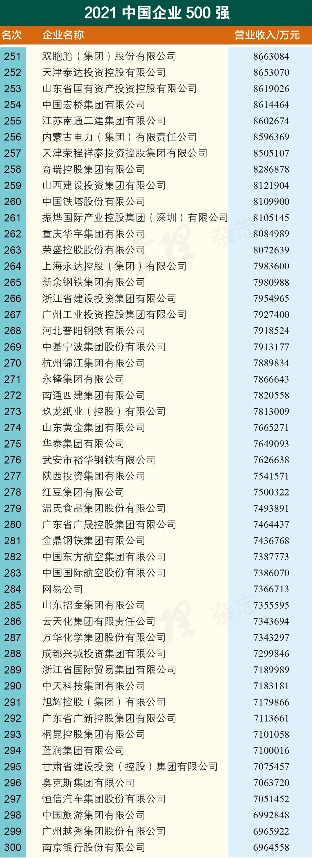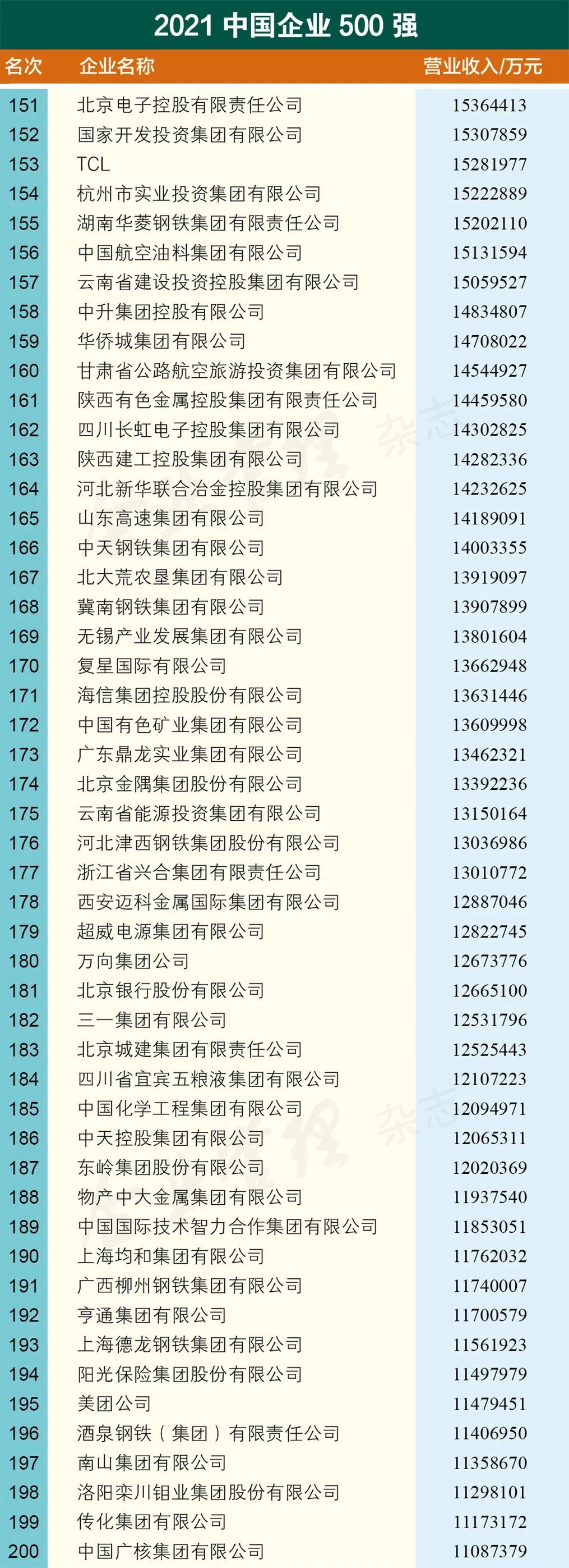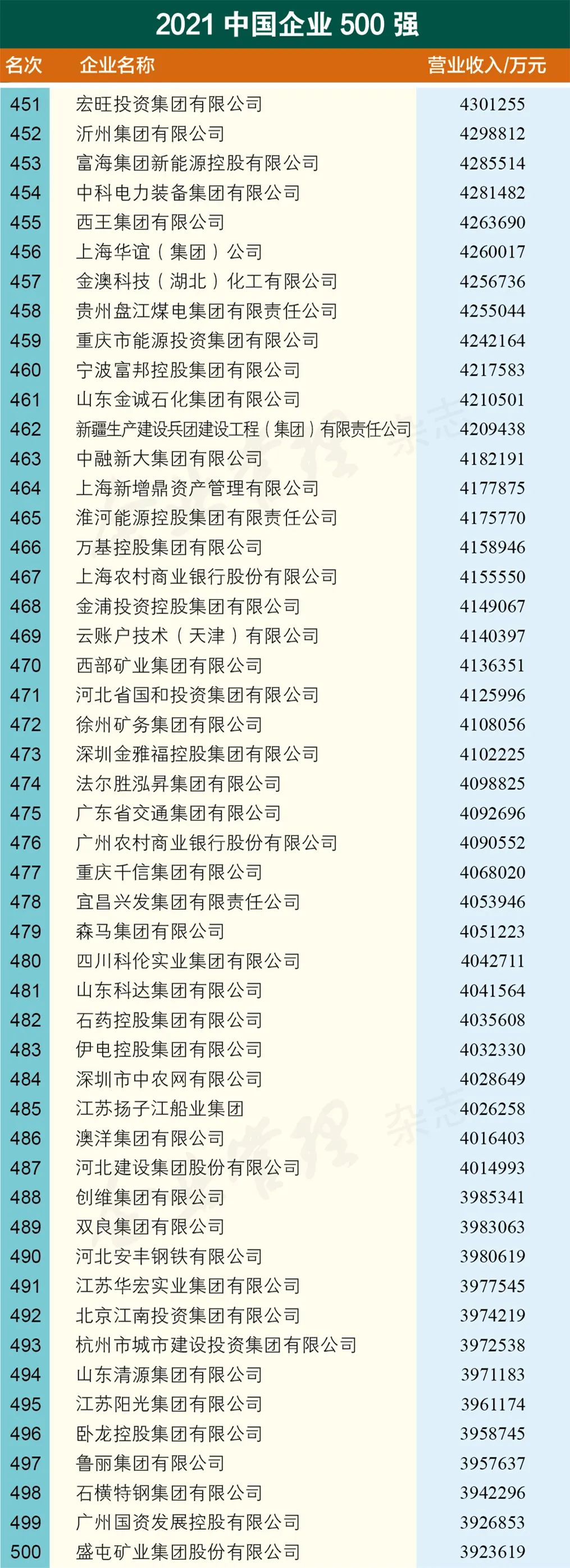 榜单显示,2021中国500强企业营业收入和净利润总额实现增长,资产扩张有所加快,千亿俱乐部企业增至222家,产业结构优化升级。