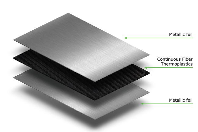 以色列Manna Laminates 公司推出了其新的有机片材FEATURE(阻燃、电磁屏蔽、美观且隔音、导热、轻质、结实且经济)FML(纤维-金属层压板)半成品原材料,这是一种整合了金属片层的层压板,金属片层可以放在层压板的外侧,或者位于增强织物层(通常为玻璃纤维或碳纤维)之间。