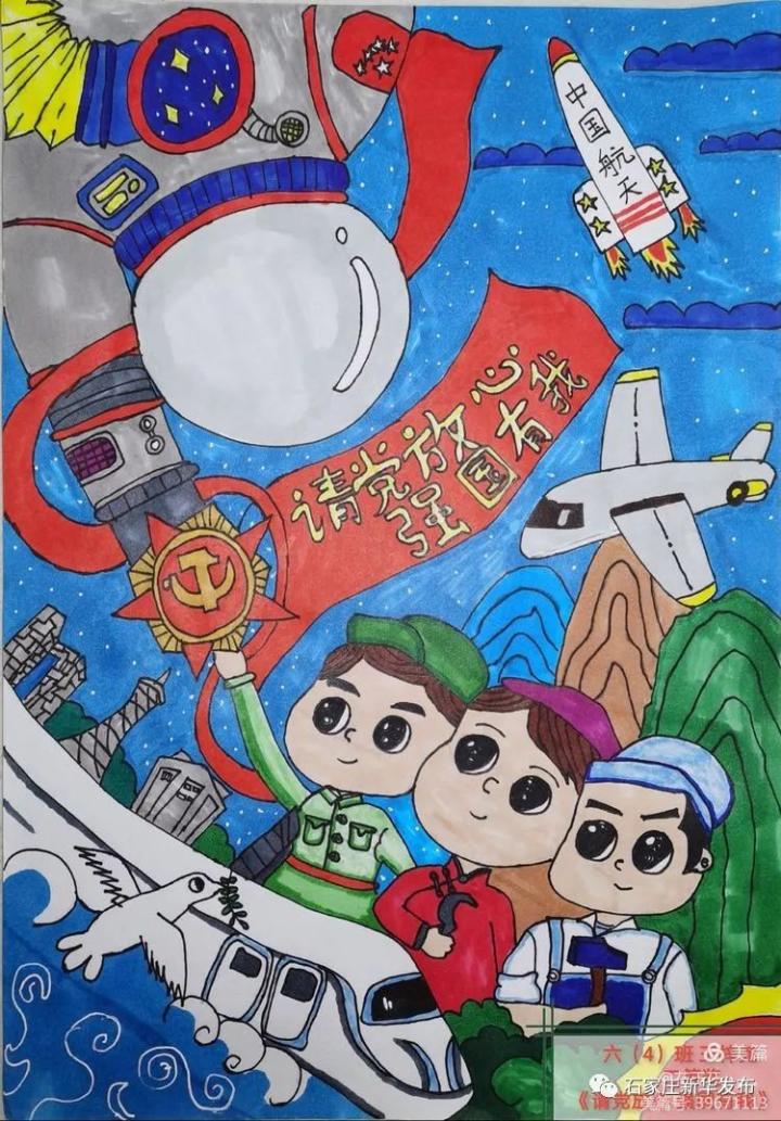 王梓尧的绘画《请党放心 强国有我》作品构图饱满,颜色鲜艳,表现了少年儿童怀揣梦想为祖国贡献一份力量的坚定信念。