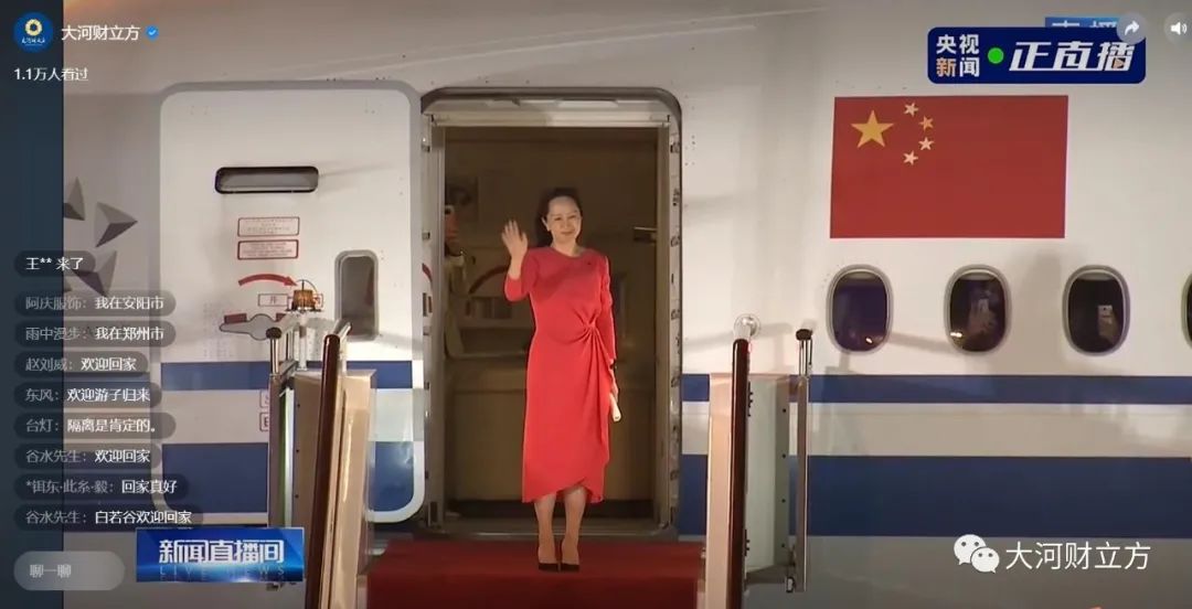 抵达后,孟晚舟在现场发表简短感言。“我想说,有五星红旗的地方,就有信念的灯塔。如果信念有颜色,那一定是中国红。”