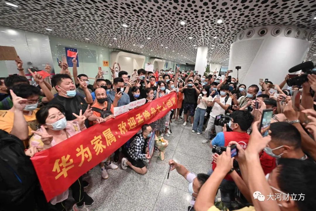 9月25日晚8点,广东深圳,宝安国际机场T3航站楼国际到达大厅便聚集了大量自发前来欢迎孟晚舟回国的人群。