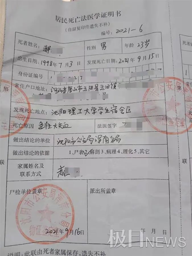 郝先生提供的死亡证明显示,小华的死亡时间为9月15日,发现死亡地点为沈阳理工大学学生宿舍区,死亡原因为急性大失血。