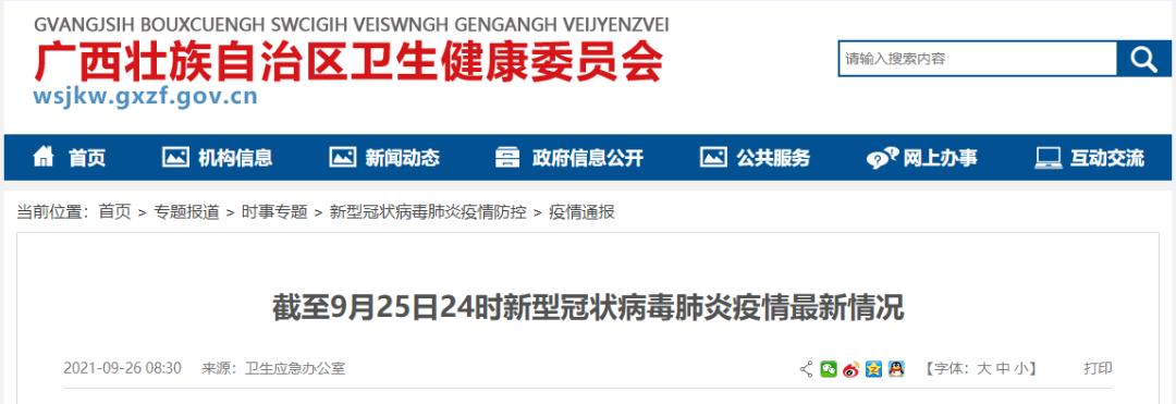 9月25日南宁市新增一例境外输入新冠肺炎无症状感染者刘某某,女,64岁,2021年8月26日从美国回国,经上海入境集中隔离解除后于9月9日返邕。到达南宁后,先后居住在兴宁区燕子岭和经开区碧翠园,期间进行2次核酸检测,结果均为阴性。9月25日进行第三次核酸检测,结果为阳性,即转入市级定点医院接受诊治。结合临床表现,经过初步流行病学调查及实验室检测,初步判定为境外输入无症状感染者,具体有待进一步深入调查核实,相关人员及场所已按规范管控。截至25日23时,共同居住的密接人员5名,已进行首次核酸检测,结果均为阴性;已对重点场所开展大规模核酸采样检测17704人,外环境110 份,已出结果16343人、108份,全为阴性。下一步,将按有关规定及时公布有关情况。