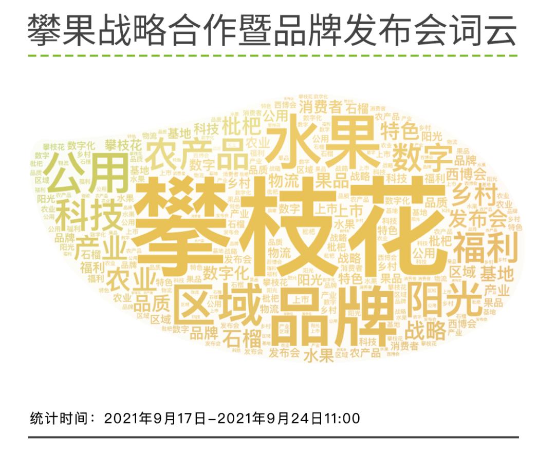 传播渠道不断扩大。据川报More大数据工作室统计,自2021年9月17日至24日七天时间里,“攀果”战略合作暨品牌发布会在全网的传播量为989篇,传播渠道包含微博686篇(占比69.36%)、网站104篇(占比10.52%)、APP103篇(占比10.42%)、微信37篇(占比3.74%)、报刊12篇(占比1.21%)、视频12条(占比1.21%)等。发布媒体包括人民网、新华社、光明日报、经济日报、中国青年报、亚旅卫视、重庆日报、四川观察、封面新闻、澎湃新闻、凤凰新闻、今日头条等多家媒体。其中,转载量最高的稿件为《四川攀枝花正式发布首个农产品区域公用品牌“攀果”》,单篇转载量为60次。