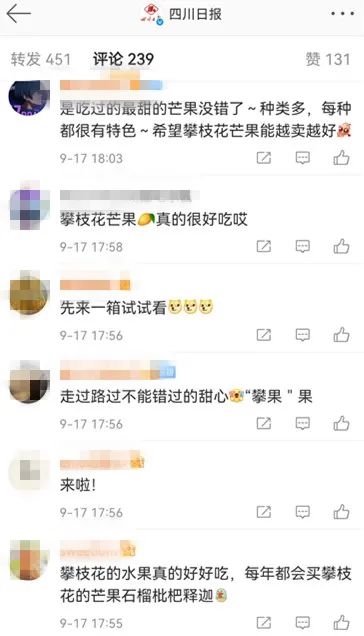 发布会当天,四川日报在新浪微博上发起#川川送福利#的微博话题,邀请广大网友用一句话为攀枝花水果call,抽出20位幸运网友每人赠送一箱芒果,吸引10余万“果粉”踊跃参与,为美妙“攀果”送去祝福。“是吃过最甜的芒果没错了,种类多,每种都各有特色,希望攀枝花水果越卖越好!”网友“被怡落的雪”说。