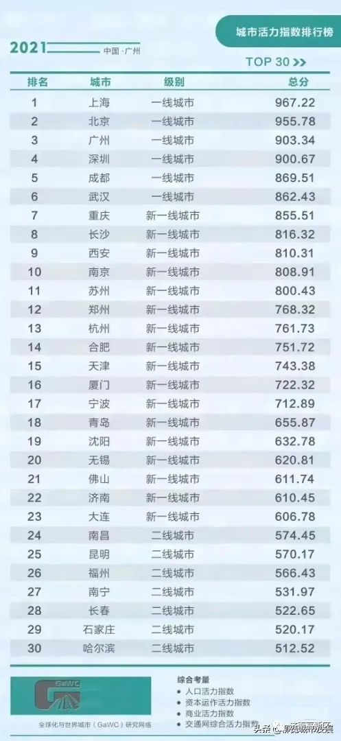 城市活力指数排行榜由“全球化与世界城市研究网络”评出,参考的依据是:人口活力指数、资本运作活力指数、商业活力指数、交通网络综合活力指数,济南位列第22位。