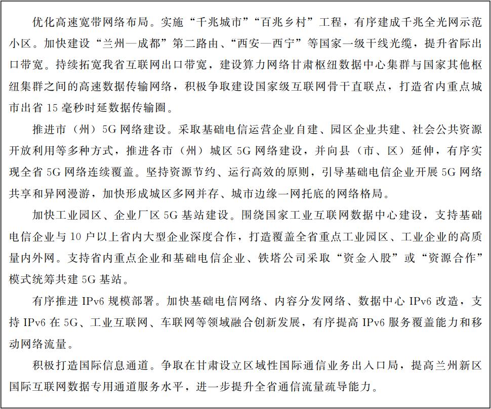数字基础设施加速升级。网络基础设施建设步伐明显加快,互联互通能力显著改善。全省建设移动通信基站达到18.6万个,其中4G(第四代移动通信)基站数量比重接近60%。截至2020年底,全省14个市(州)实现主城区5G(第五代移动通信)网络覆盖,5G网络人口覆盖率达到24%以上,县(市、区)网络平均出口带宽达到200G以上,百兆以上宽带用户占比达到92.5%;行政村光纤宽带和4G网络覆盖率达到99%以上。兰州建成西北第二大信息通信网络枢纽,互联网出省带宽达到14.8T,实现与北京、西安、成都等核心节点城市以及西宁、拉萨、乌鲁木齐、银川等重点城市的网络直联。以兰州新区国际互联网数据专用通道为依托,建成兰州新区至金昌、酒泉、天水等市高速网络链路,有效提升通道运营服务能力。统筹布局大数据中心,数字化基础设施建设实现跨越式发展。截至2020年底,全省建成运行300个机柜以上数据中心36个,各类数据中心机架总数达到59012架,可对外提供服务机柜30176个,PUE(平均电能利用效率)值1.31。金昌紫金云大数据中心、丝绸之路西北大数据产业园数据中心、甘肃联通马滩大数据中心、甘肃国网云数据中心等投入运营。在建或拟建数据中心项目17个,可部署机架(功率超过2.5KW)12.1万架,设计PUE值约1.27,绿色集约大数据集群初步形成。