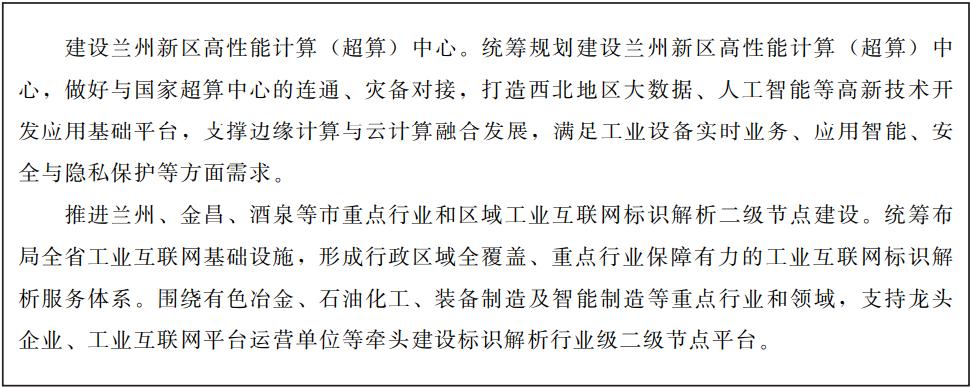 推动国家新一代人工智能创新发展试验区落地甘肃,规划建设一批人工智能超算中心,打造人工智能数据资源、计算能力、标准体系、测试评估等服务平台。依托大数据中心集群,打造数字智能产业链。加快引进国内外人工智能领军企业,推进人工智能在民生领域的融合应用,促进技术集成和商业模式创新。整合省内高校人才资源,联合国内外顶级人工智能机构,打造一流的人工智能超算产业基地。