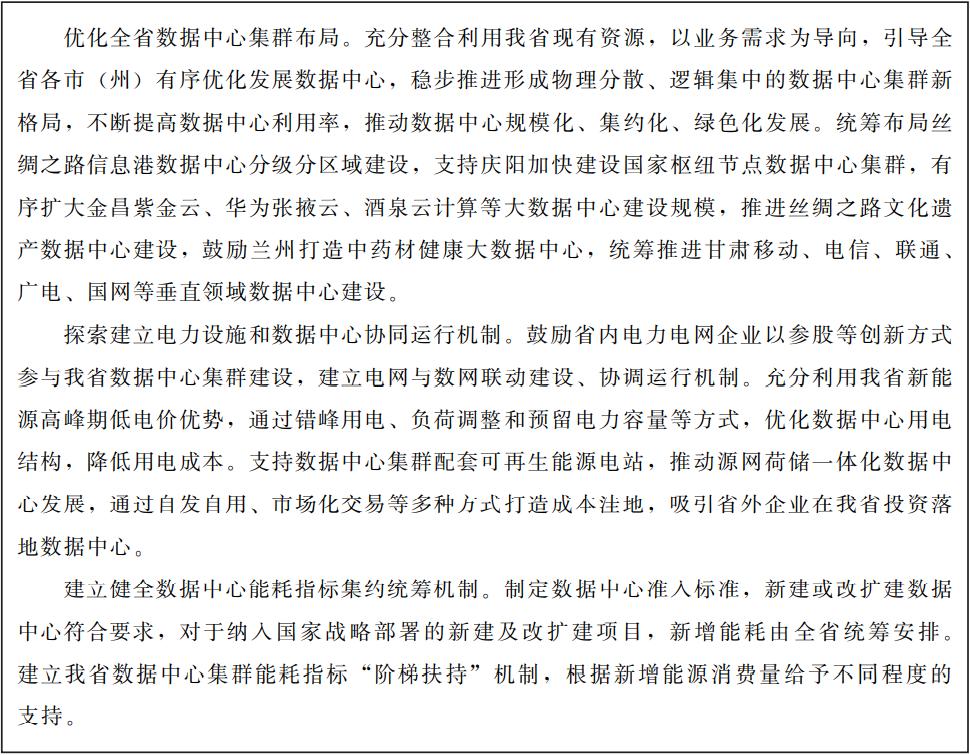 围绕全国一体化算力网络国家枢纽节点(甘肃)建设,统筹优化全省数据中心布局,引导传统数据中心升级改造,向规模化、集约化、智能化、绿色化方向布局发展。探索建立电力设施和数据中心协同运行机制、数据中心能耗指标共享统筹机制。