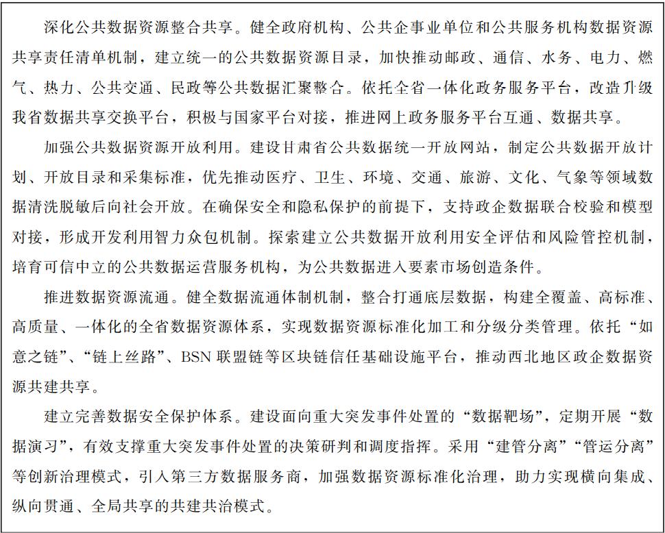 持续完善甘肃省数据共享交换平台体系,加强政务信息共享应用。探索运用数据沙箱、多方安全计算、联邦学习等新技术,建立公共数据定向开放和开发利用机制,促进政务数据库和公共数据库依法合规向社会开放,深化公共数据资产化开发利用。