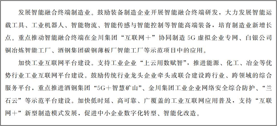 围绕沿黄河流域、河西走廊、陇东南三大产业聚集带的空间布局,聚焦石化、能源、冶金、装备制造等重点行业,打造智能制造产业集群,全面提升企业数字化水平,形成智能制造为驱动的新型工业体系。