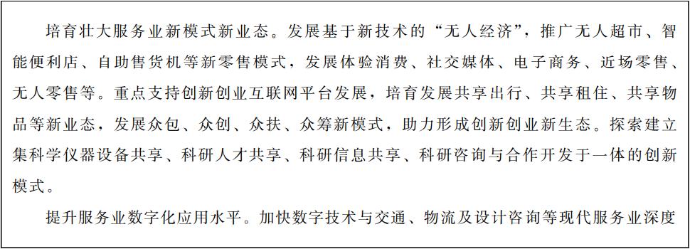 面向金融、交通运输、节能环保等行业,拓展数字技术应用场景,促进智能物流、智慧交通、数字金融等发展,推动构建电子商务、物流服务、创新创业、环境能源交易等服务平台,推进生产性服务业数字化发展。聚焦旅游、健康、养老、教育、餐饮、娱乐等领域,有效整合利用线上线下资源,发展体验式消费、个性需求定制服务等新业态,推进生活性服务业数字化升级。