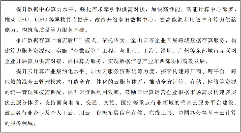 依托超大规模数据中心、5G基站、高速网络等新型基础设施建设,围绕离线分析、采集标注、后台加工、数据存储、海量数据计算等,积极对接东部数据存算需求,为工业互联网、车联网、人工智能推理等提供算力服务,打造超大型绿色数据中心集聚区、国家算力资源协同调度先行区、西部数据要素创新应用示范区。