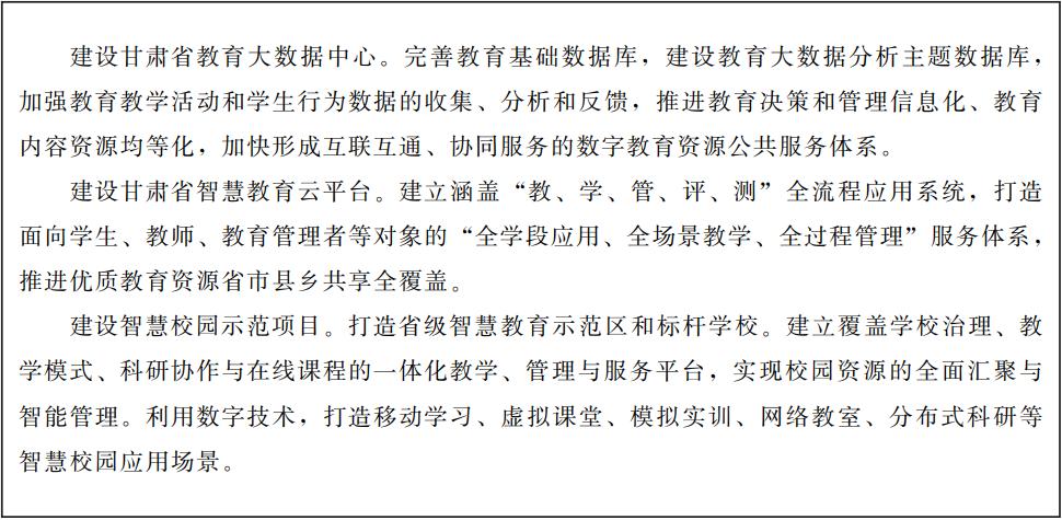 积极推进教育行业数字化转型,加快建设基于互联网、云计算技术的教育云平台。创新“互联网+教育”模式,鼓励支持各级各类学校在线教育发展,构建线上线下教育常态化良性互动机制,打造线上线下教育融合发展的新业态。