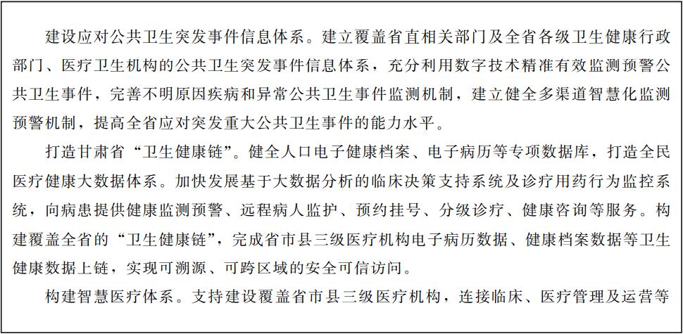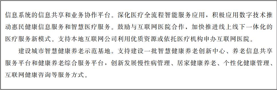 加快建设全民医疗健康管理服务大数据管理平台,打造以居民健康档案为重点的全民健康信息平台和医疗协作系统。推广发展云医院、在线医生业务,创新远程医疗服务模式,提升医疗资源利用效率和健康医疗服务质量。