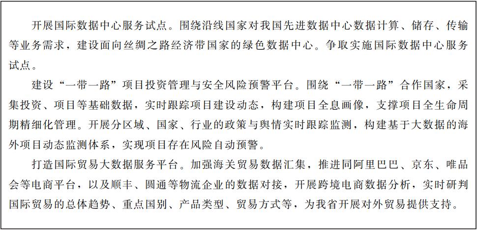 搭建“数字丝绸之路”大数据综合服务平台。建设“一带一路”项目投资管理与安全风险预警综合服务、国际贸易大数据服务等平台,向产学研机构、“走出去”企业提供高质量数据与咨询服务。
