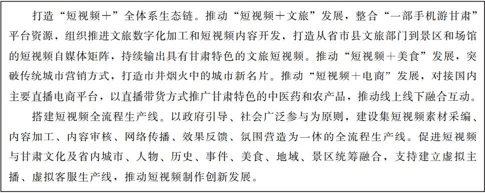充分挖掘甘肃厚重的历史文化旅游资源,在文化、旅游、民俗、美食、电商等领域与5G、短视频、音频、虚拟现实、在线直播等新技术业态相结合,引入短视频服务类、音频服务类、云服务类、电商类企业,以数字内容生产为抓手,打造“线上引流、线下转型”的发展新模式,实现“一业带百业”。