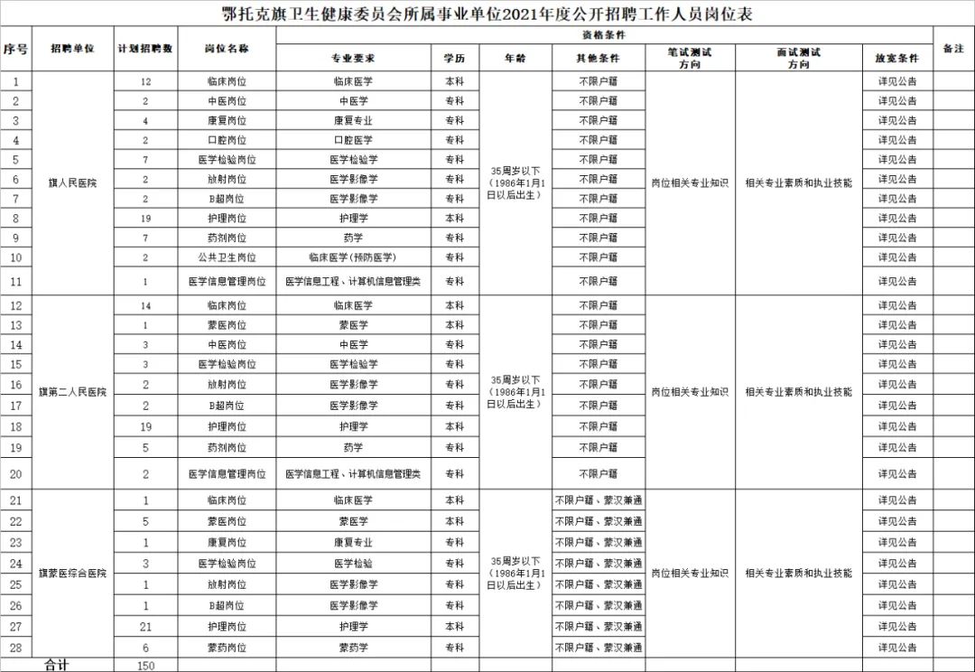 本次公开招聘计划为鄂托克旗卫健委所属事业单位鄂托克旗人民医院、鄂托克旗第二人民医院、鄂托克旗蒙医综合医院公开招聘医疗卫生技术工作人员150名,具体招聘岗位详见《鄂托克旗2021年公开招聘医疗卫生技术工作人员职位表》