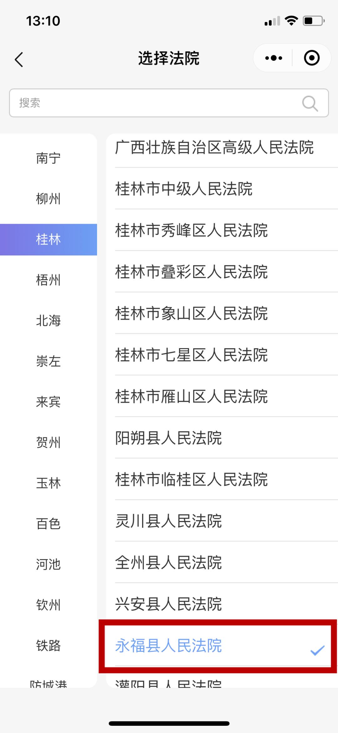 第四步:选择“桂林市永福县人民法院”(点击选择法院,双击选择“永福县人民法院”)。
