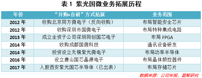 紫光国微主要通过外延并购的方式拓展业务范围,可以看出(见表1),下属不同的子公司分别负责不同的领域。