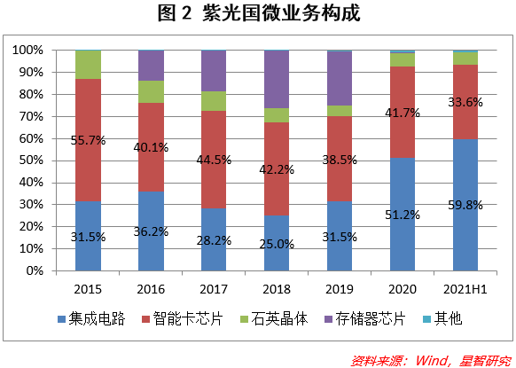 纵观紫光国微近年来的业务发展(见图2),可以清晰地看出,在2016年-2019年期间,公司尝试业务多元化发展,但浅尝辄止,2020年以来,逐步淡出石英晶体、存储器芯片等相关领域,形成特种集成电路和智能安全芯片两大专精板块为主导的业务模式。