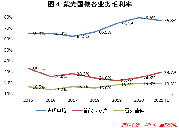 2015年至2019年,国内安全芯片行业竞争激烈,厂商数量不断增加,导致智能安全芯片的毛利率不断下滑,紫光国微也不能独善其身。但紫光国微智能安全芯片的毛利率在近两年逐步企稳抬升(见图4),显示出公司在相关领域的优势地位已经确立。