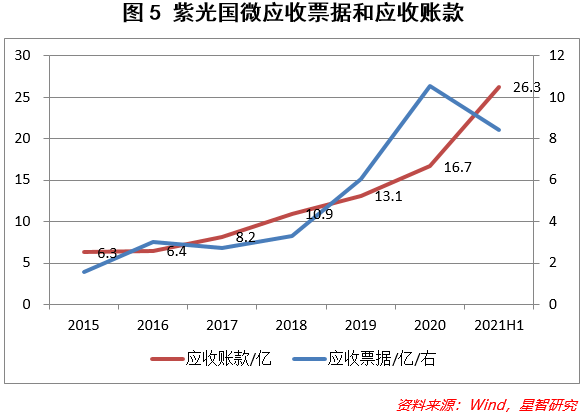 特种集成电路对产品的稳定性、安全性、可靠性等有较高的要求,因此技术壁垒较高,下游客户粘性高,从而容易形成规模效应。这是特种集成电路业务高毛利的主要原因,但与此同时,紫光国微的应收票据和应收账款均显著增加(见图5),这是因为特种集成电路业务的销售账期较长,而原先销售账期较短的存储芯片业务出表,此消彼长,加大了公司回款的压力,这是值得投资人关注的地方。