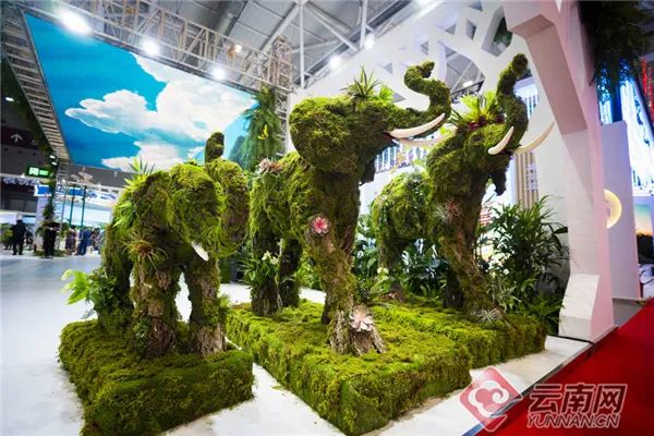 展区入口处,以“北移象群”中最有代表性的可爱短鼻小象为原型,用云南植物制作成了三头迎宾象,欢迎大家来到云南展区。右侧的天幕大屏上,“北移象群”一路逛吃的影像被循环播放。“云南野象旅行记”由此成为世界认识云南的新“标签”。