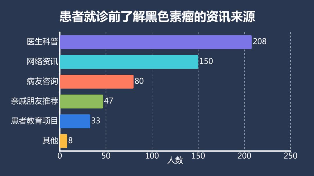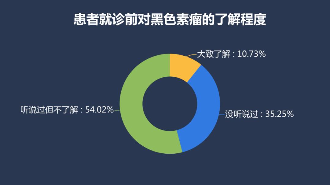 患者对黑色素瘤的疾病认知程度,会直接影响患者是否能够及时就诊和治疗。调研结果显示,1/3患者在就诊前没听说过黑色素瘤,因此我国大部分黑色素瘤患者前来就诊时分期较晚,可能和患者的疾病认知程度不足密切相关。