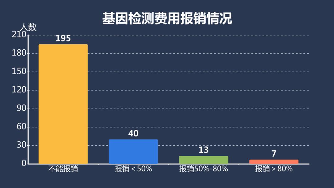 在参与调研的患者中,98%接受了至少1次基因检测,但存在2%的患者仍未做基因检测,检测率并未实现患者群体的完全覆盖。究其原因,一方面是由于患者对基因检测的认知不足;另一方面可能是由于基因检测费用高昂。