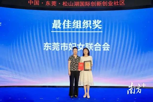 东莞市妇女联合会获得最佳组织奖,东莞市妇联主席黄伟青上台领奖。全国妇联发展部副部长杜伟丽为最佳组织奖单位颁奖。
