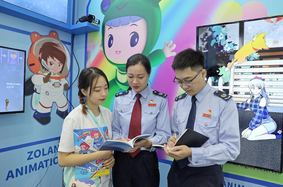 图为国家税务总局杭州市滨江区税务局干部为浙江中南卡通股份有限公司介绍动漫优惠税收政策。卢婵婵/摄