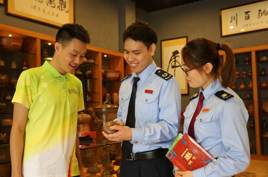 图为国家税务总局钦州市税务局干部到坭兴陶企业宣传税费优惠政策。