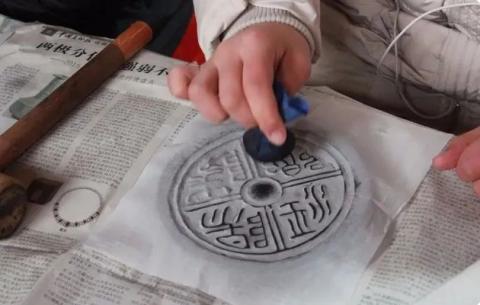 展览现场放置拓印用品、拓印的步骤图文详解,有兴趣的游客可以在现场亲自体验拓印技艺,感受传统技艺的魅力。