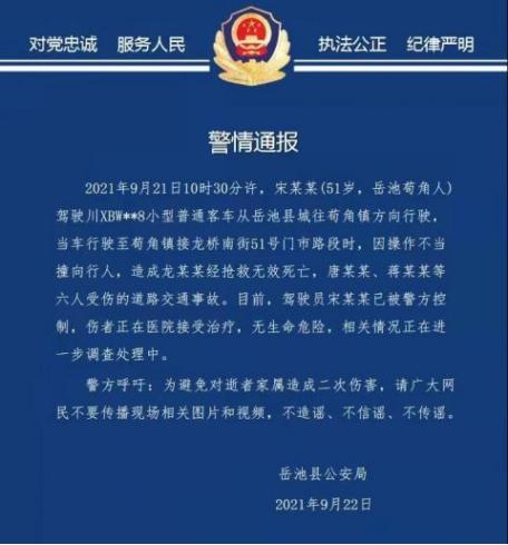 9月21日10时30分许,一小型普通客车从岳池县城往苟角镇方向行驶,当车行驶至四川岳池苟角镇接龙桥南街51号门市路段时,因操作不当撞向行人,造成一人经抢救无效死亡,六人受伤。相关情况正在进一步调查处理中。