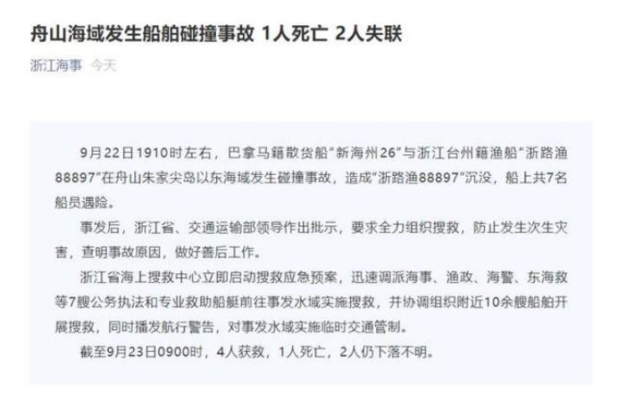 9月22日19时许,浙江舟山朱家尖岛以东海域发生一起船舶碰撞事故。巴拿马籍散货船“新海州26”与浙江台州籍渔船“浙路渔88897”相撞,造成“浙路渔88897”沉没,船上共7名船员遇险。截至23日9时许,本次船舶碰撞事故中,有7名船员遇险,其中有4人已获救,1人死亡,2人仍下落不明。目前,失联人员搜救正在进行中,事故原因正在调查。