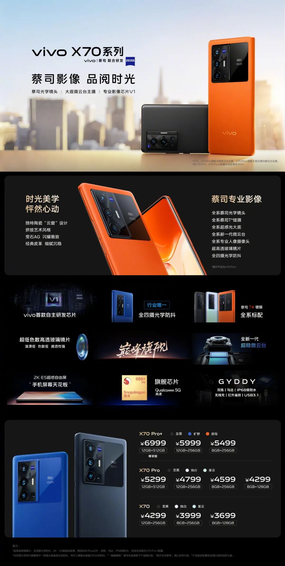 2021年9月17日,vivo X70 Pro+正式开售。搭载vivo&蔡司联合研发的影像系统,配备蔡司光学镜头,使vivo X70 Pro+摄影功能更加强大。