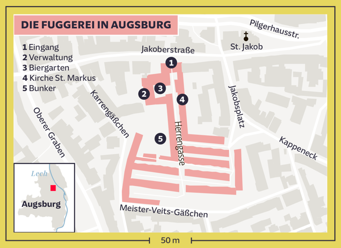 奥格斯堡的富格社区由67座房屋与142套住房组成。游客支付费用便能够参观隶属的教堂、露天啤酒馆以及博物馆,模板住房与二战地堡。大约150名信奉天主教的贫困奥格斯堡居民生活于此处,他们每年需缴纳88欧分的房租以及每日行三次祷告,并且常常与游客们交谈。