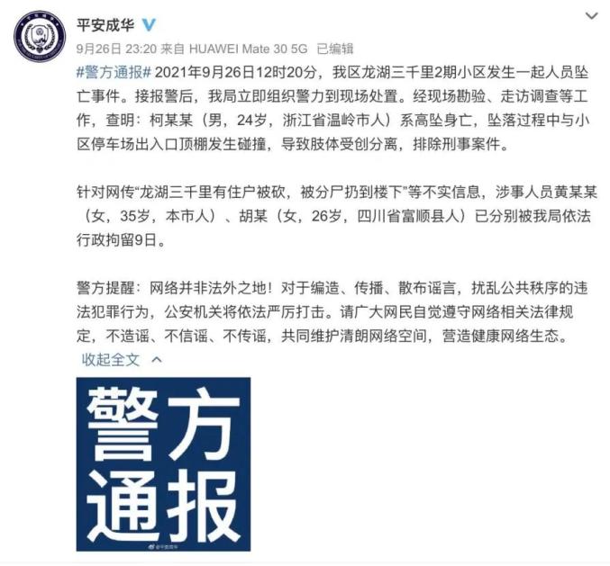 对此,@平安成华在微博发布通告进行辟谣,“2021年9月26日12时20分,我区龙湖三千里2期小区发生一起人员坠亡事件。接报警后,我局立即组织警力到现场处置。经现场勘验、走访调查等工作,查明:柯某某(男,24岁,浙江省温岭市人)系高坠身亡,坠落过程中与小区停车场出入口顶棚发生碰撞,导致肢体受创分离,排除刑事案件。”在网络散布“分尸”谣言的黄某某和胡某也因此分别被公安局依法行政拘留9日。