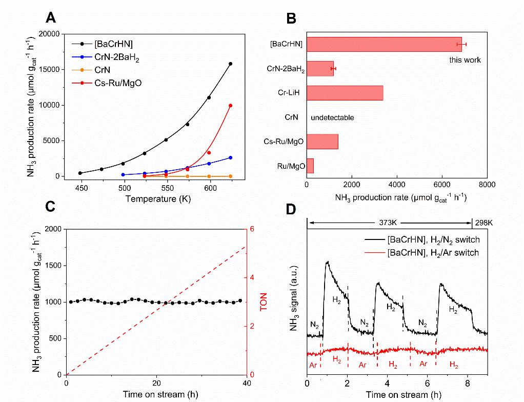 (A)不同温度下的催化剂的合成氨活性;(B)不同催化剂活性比较;(C) [BaCrHN]催化剂的稳定性测试;(D) 低温催化剂合成氨活性的确定。