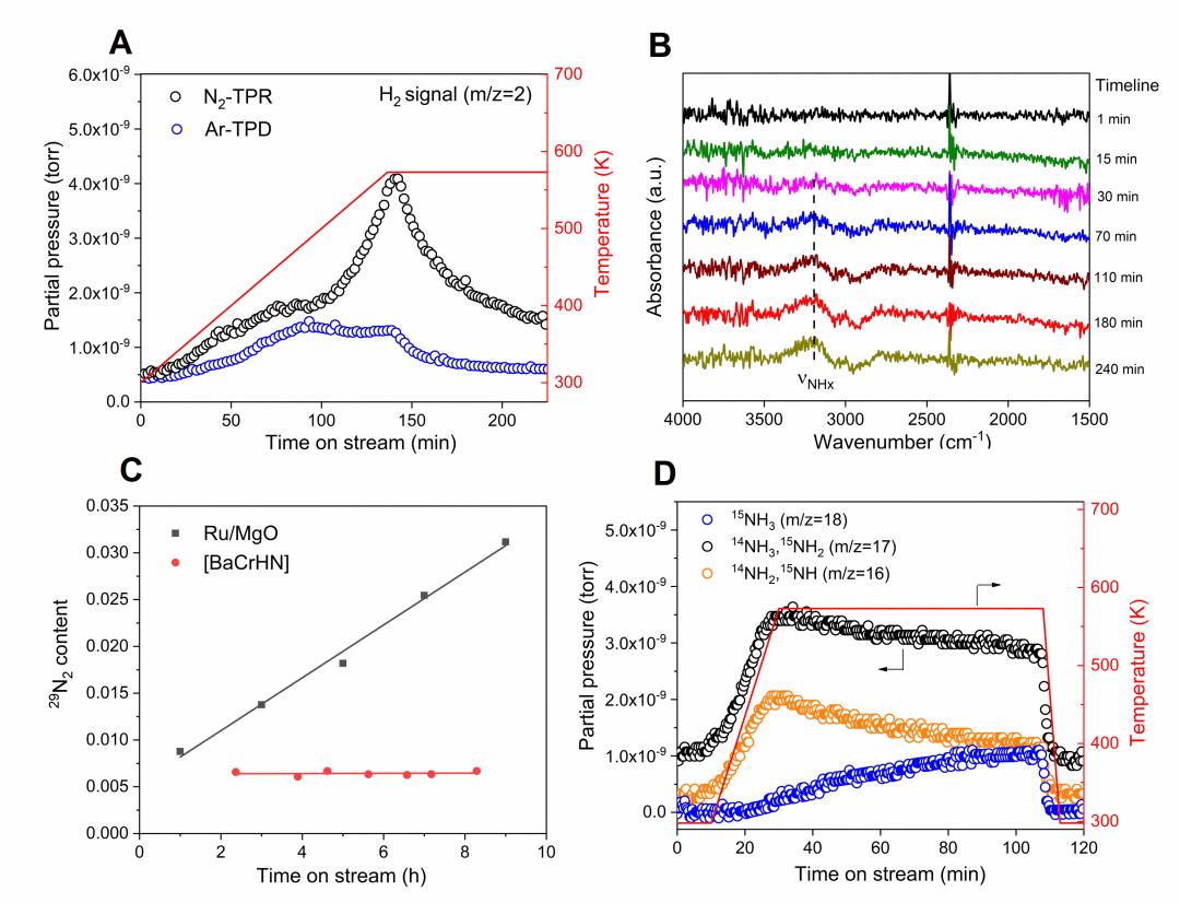 (A) 氮气流及氩气流下TPR-MS的比较;(B)氮气氛下原位红外光谱;(C) N2同位素交换实验;(D) 同位素瞬态动力学分析。