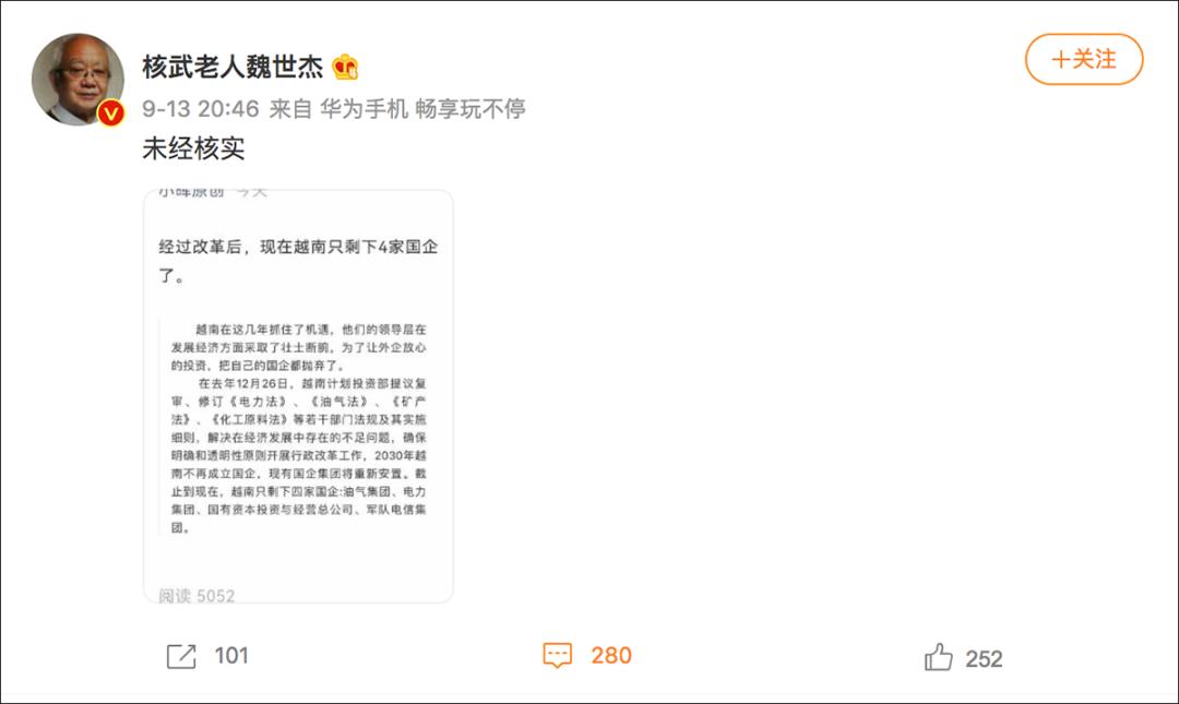 近日,微信和微博上流传截图称:“越南在这几年抓住了机遇,他们的领导层在发展经济方面采取了壮士断腕,为了让外企放心投资,把自己的国企都抛弃了。……截止到现在,越南仅剩下四家国企。”