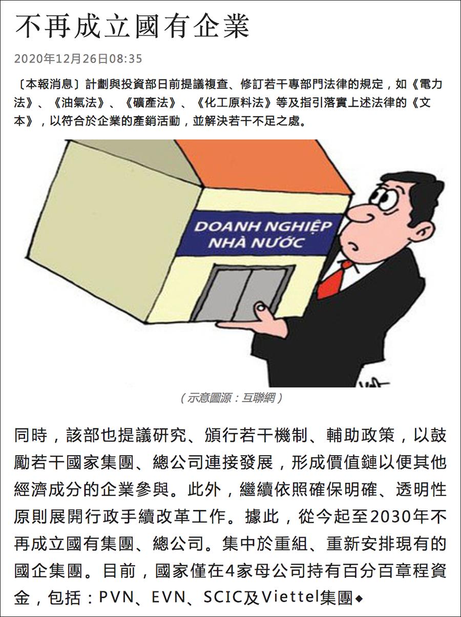 经核查,越南正在进行大规模的国有企业改革,从现在起至2030年不再成立新的国有集团和国有企业,集中于现有国企集团的重组和重新安置,将来国家将仅持有4家国有母公司100%的注册资本,而非越南仅剩4家国有企业。