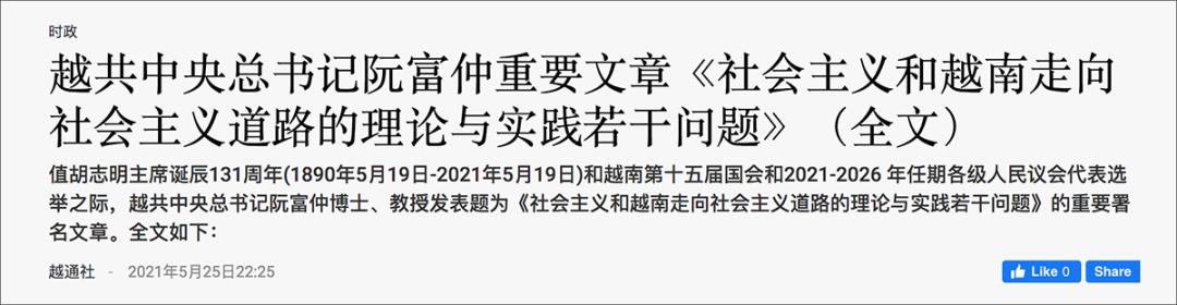 2021年5月,越共中央总书记阮富仲发表题为《社会主义和越南走向社会主义道路的理论与实践若干问题》的署名文章。