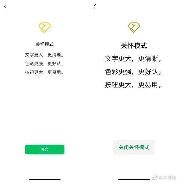 相比正常模式,微信“关怀模式”文字更大更清晰,色彩更强更好认,按钮更大更易用,有助于提升老年人、视障群体等人群使用微信的便利性。