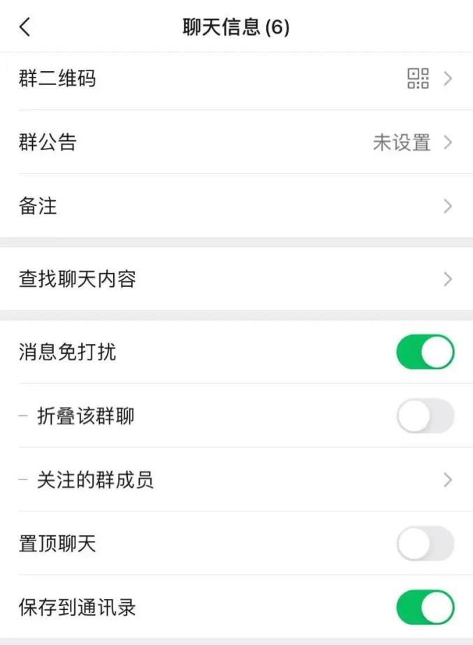 在群聊的设置页面,打开“消息免打扰”,新出现了“折叠该群聊”的开关按钮。