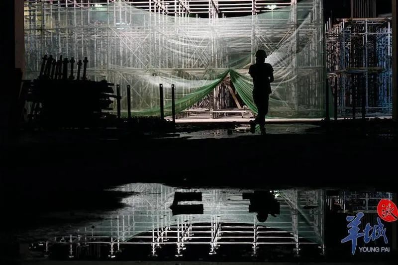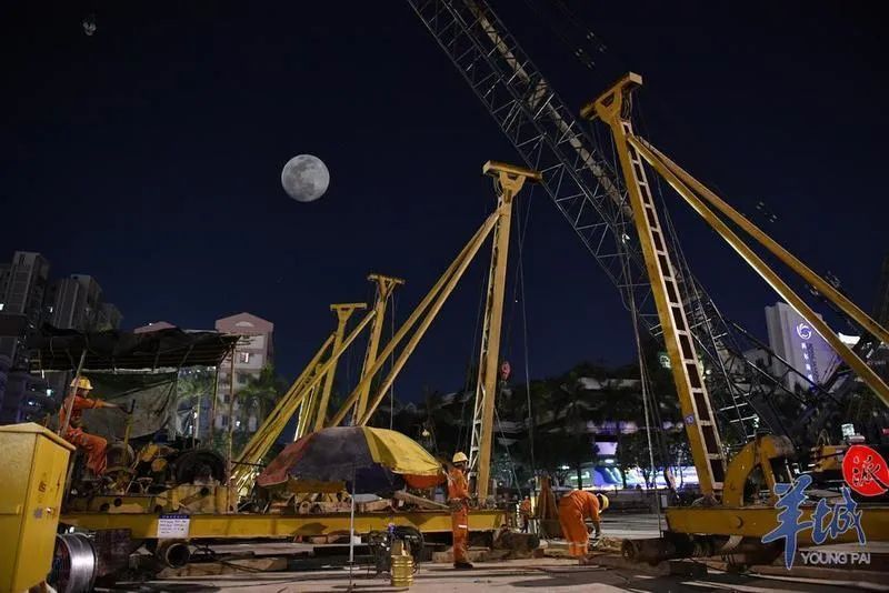 2020年5月“超级月亮”夜,工人们在工地上忙碌