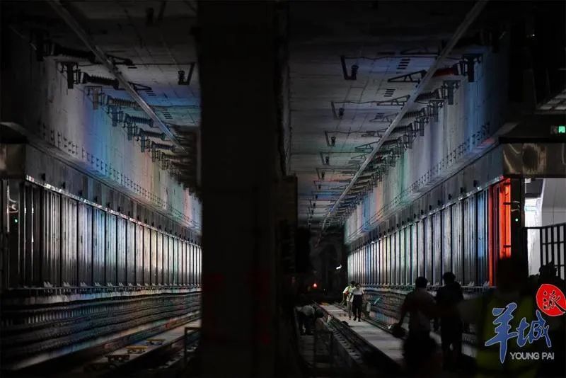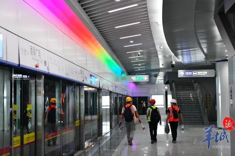 2021年9月,广州地铁18号线即将建成开通运营,工人们走出番禺广场站台