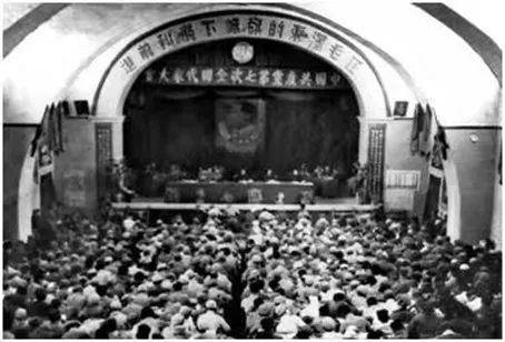 1945年4月至6月,中国共产党第七次全国代表大会在延安杨家岭中央大礼堂召开。出席大会的正式代表547人,候补代表208人,代表着全国121万名党员。党的七大是党在新民主主义革命时期召开的一次极其重要的全国代表大会。它总结中国新民主主义革命20多年曲折发展的历史经验,制定正确的路线、纲领和策略,克服党内的错误思想,使全党特别是党的高级干部对于中国民主革命的发展规律有了比较明确的认识,从而使全党在马克思列宁主义、毛泽东思想的基础上达到空前的团结。七大以“团结的大会,胜利的大会”载入党的史册。