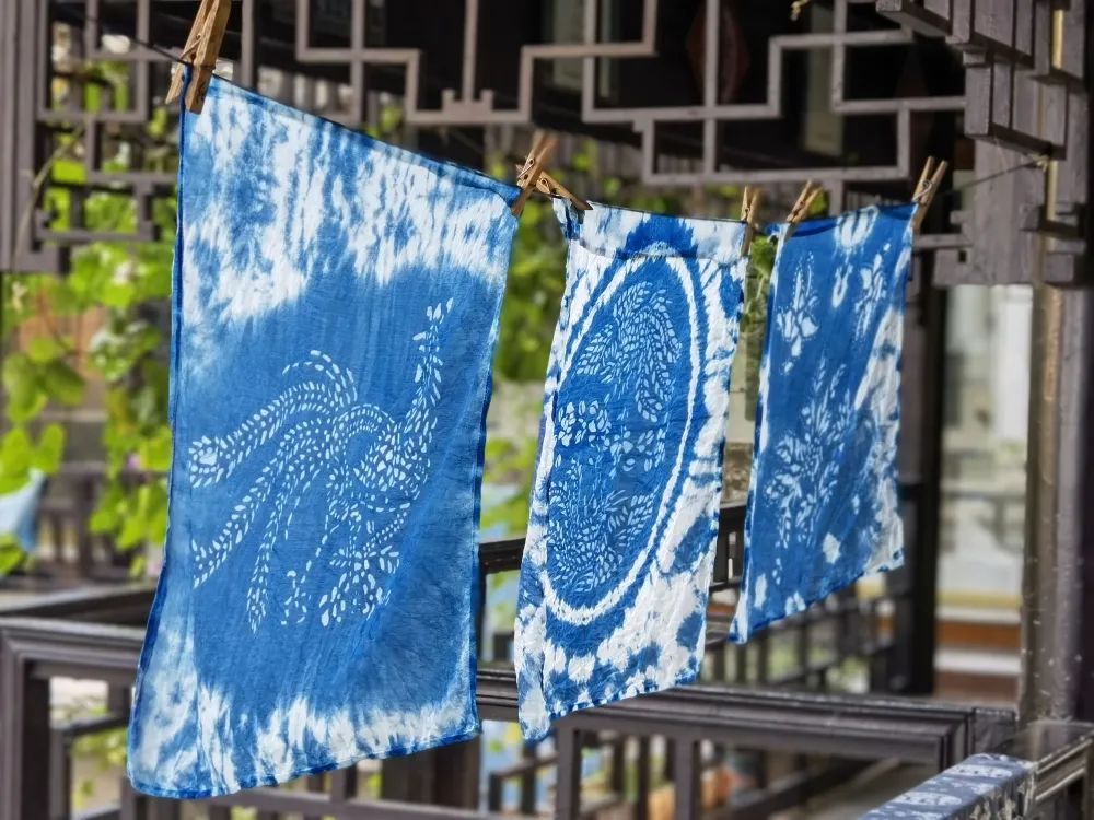 在馆内工作人员的示范下,一行人目睹了一块白色绸布从普通到夺目的惊艳蜕变。刻板、刮浆、扎染、晾晒,工序多而复杂,且每一道流程都考验着手艺人的技术能力。当成品展开并晾晒于阳光之下时,一行人无不为这蓝白典雅之色所折服,深刻感受到传统工艺与现代审美相结合后所释放的魅力。
